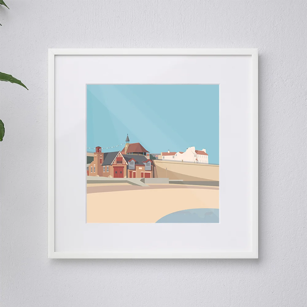 Inspired by British Railway’s travel posters of the past, this print features Cullercoats Bay and the historic RNLI Lifeboat Station.